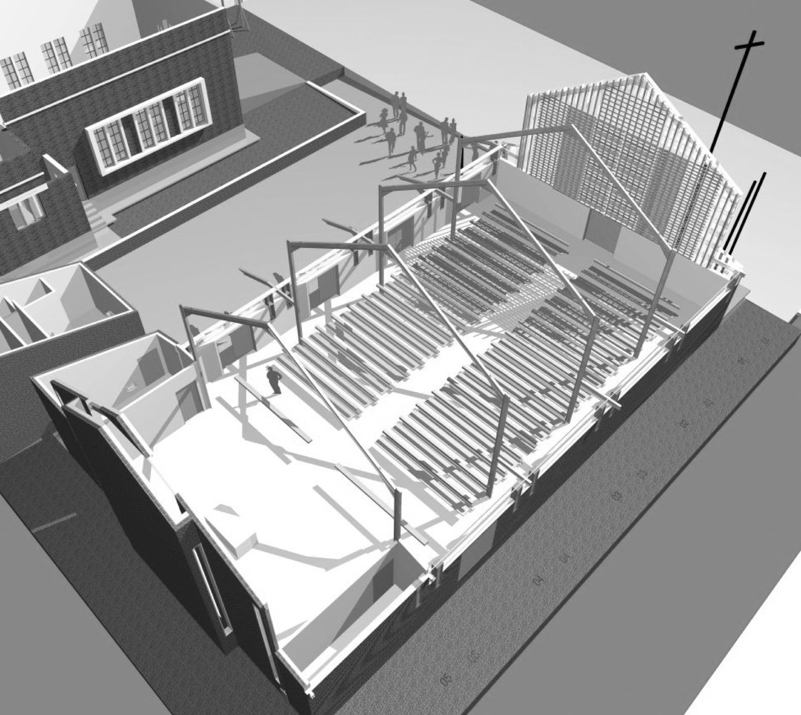 A new parish church seating 300 people, under the auspices of the Catholic Diocese of Dundeee, is made of a simple steel frame. draped with corrugated steel sheeting. The new church is adjacent to the existing smaller church which is now used as a Church hall. Construction progressed as funds become avwhite ailable.