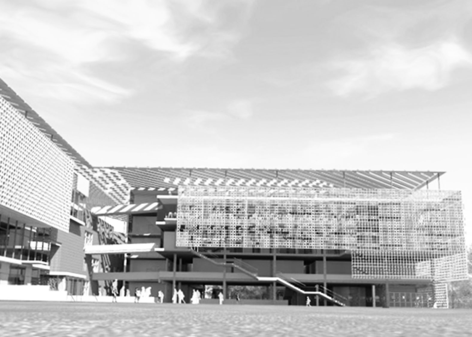 The new University of Mpumalamga central building combines teaching, assembly and library facilities, all wrapped with screens which temper the strong lowveld light. The screen blocks use binary code to repeat the phrase “ learning is light” in all eleven South African official languages. The pedestrian way from the foot of the future campus cuts through the two halfves of the complex. A cloud of photovoltaic panels provides a horizontal screen to the roof.