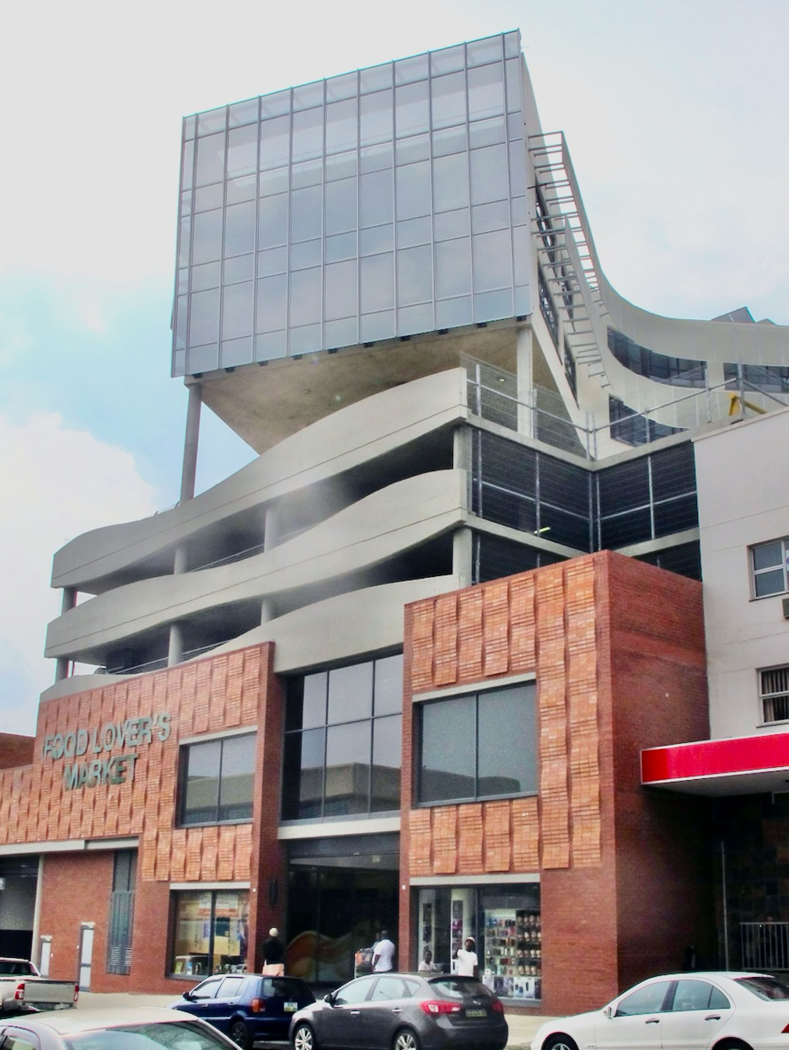 Glazed sunscreens face the two main streets of the town, facades to offices which float over parking decks above a conference facility and two levels of shops, entered from the streets. The form is a response to the narrow site bridging the block and orientation to the sun. The patterned brick facades bring texture and scaled detail to pedestrian level.